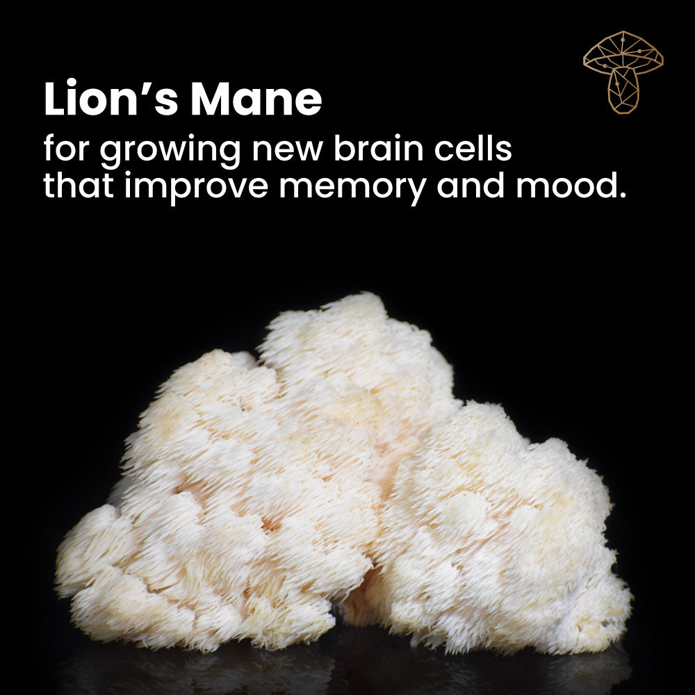 Lion’s Mane has a range of long-term, positive effects on the brain. It helps increase Nerve Growth Factor by acting on Brain Derived Nerve Growth Factor (BDNF) pathways. It helps generate new neurons in the brain’s dentate gyrus, a part of the hippocampus. It helps attenuate amyloid-B (beta) plaques. And it impacts neuronal apoptosis, helping to keep neurons healthier for longer. Clinical trials have indicated that Lion’s Mane could ameliorate cognitive impairment, such as learning, memory and concentration. It’s also involved in the regrowth of myelin which allows brain signals to travel through axons. Furthermore, Lion’s Mane has been seen to aid hippocampal neurogenesis, leading to improved recognition memory and mood, and reduction of anxiety.