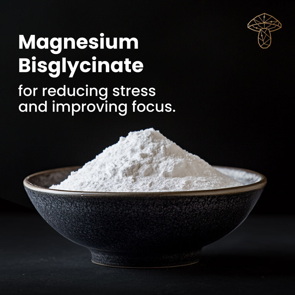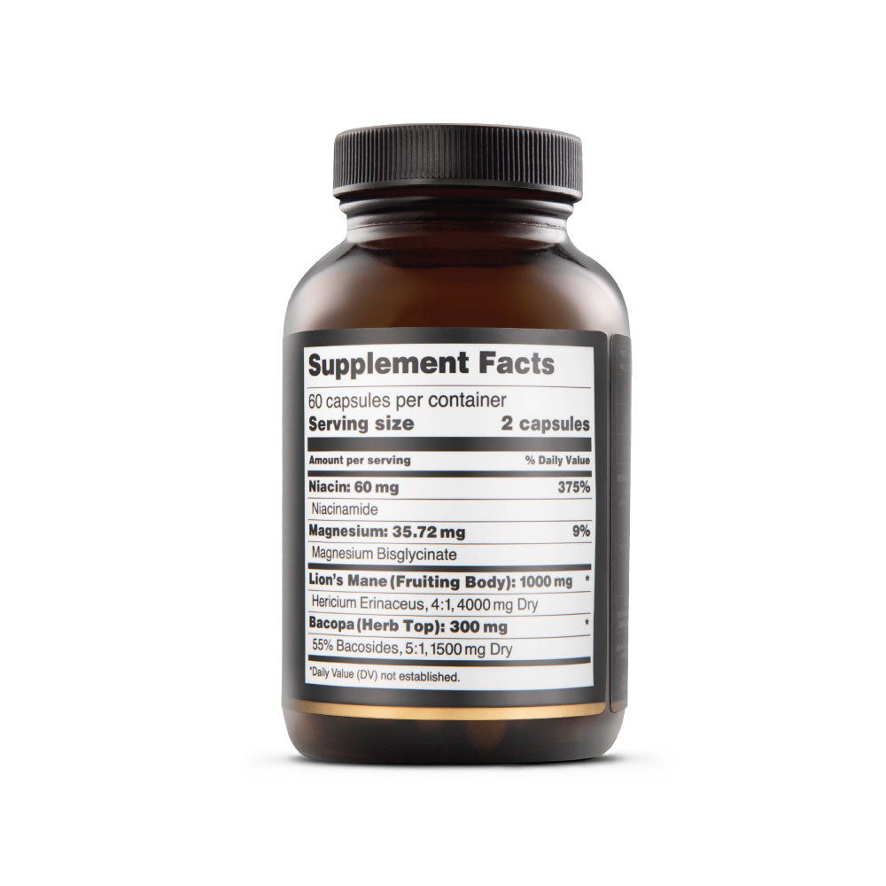 Magnesium Bisglycinate has higher bioavailability, and helps both the Lion’s Mane and the Bacopa Monnieri to act optimally by improving the overall metabolism of neurotransmitters. It regulates NMDA receptor activity which is implicated in neurological disorders. It reduces cortisol, resulting in reduced stress and anxiety along with greater focus. It regulates calcium to protect against neuronal damage and cell death.